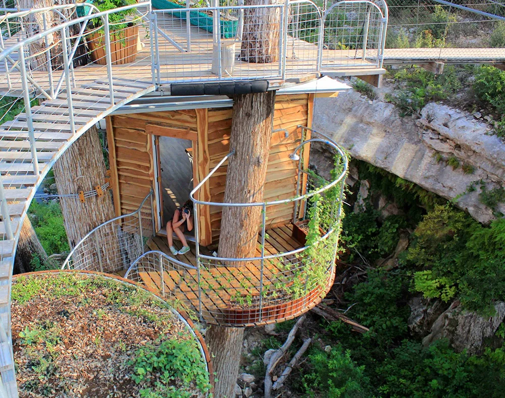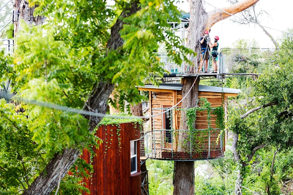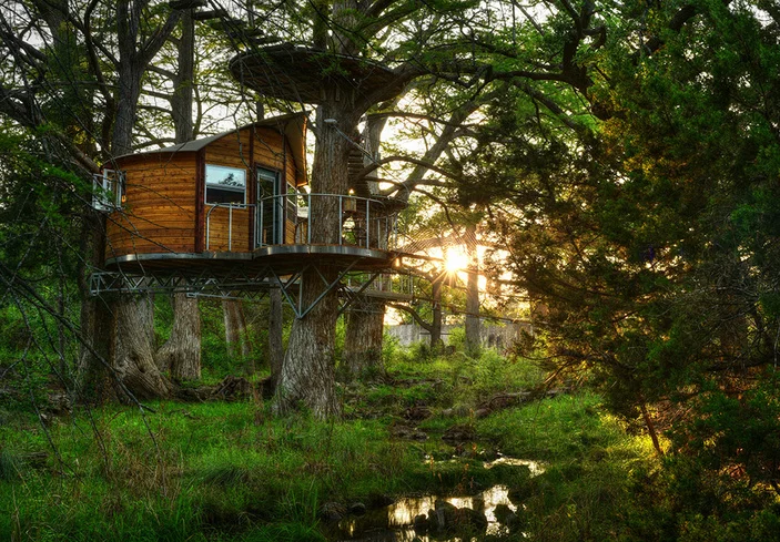 Spend the night in a treehouse after ziplining through a canopy of trees at Cypress Valley Canopy Tours.