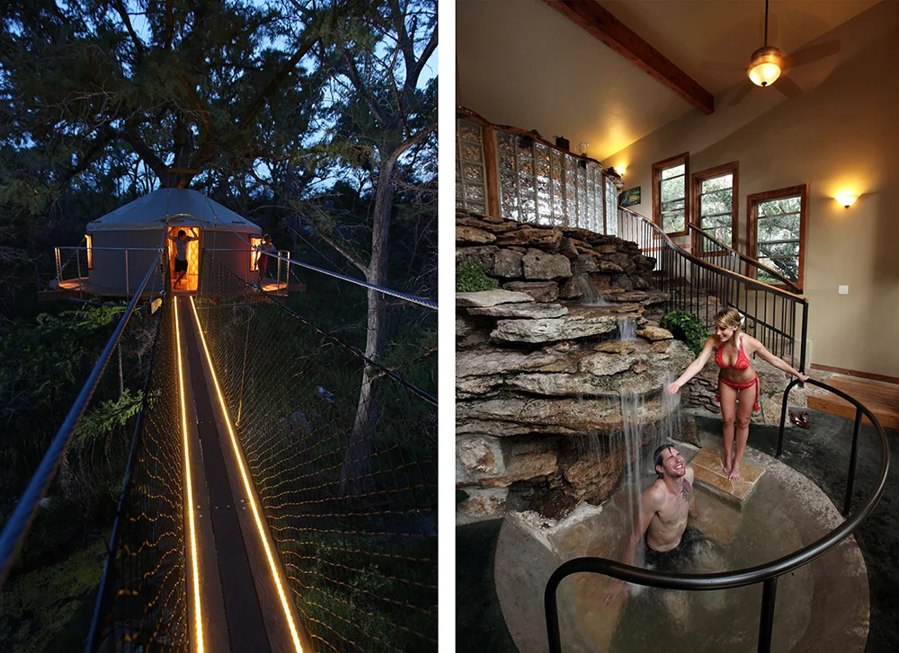 The Lofthaven is the perfect treehouse for a romantic outing with a yurt high above the ravine and a private soaking pool. Photos courtesy of Cypress Valley Canopy Tours