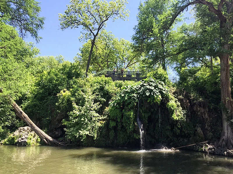 Picture sitting in the shade of ages-old oak and cypress trees creating a canopy overhead. You look straight out to a waterfall trickling down into a deep pool of fresh spring water.